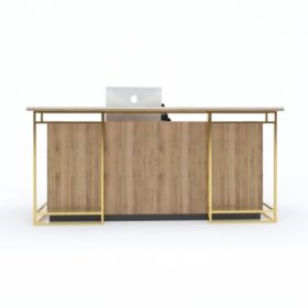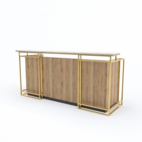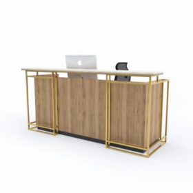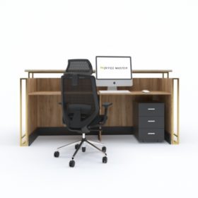 ORO Reception Desk designed with clean horizontal lines, geometric accents, and elegant gold coated metallic bars. This ORO front office counter desk blends aesthetics with practicality when accompanied with a 3-drawer lockable mobile storage pedestal. Its distinctive wood board texture is fully customizable with any of our MDF wood board textures. You can also choose any metallic coating, either matte or glossy finishes, and any other optional branding or lighting features. Contact OfficeMaster sales team to guide you craft a reception area speaking directly to your company’s identity and values.