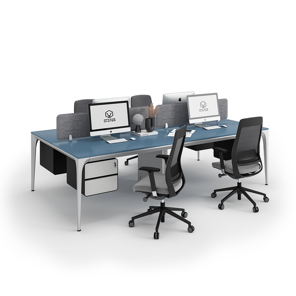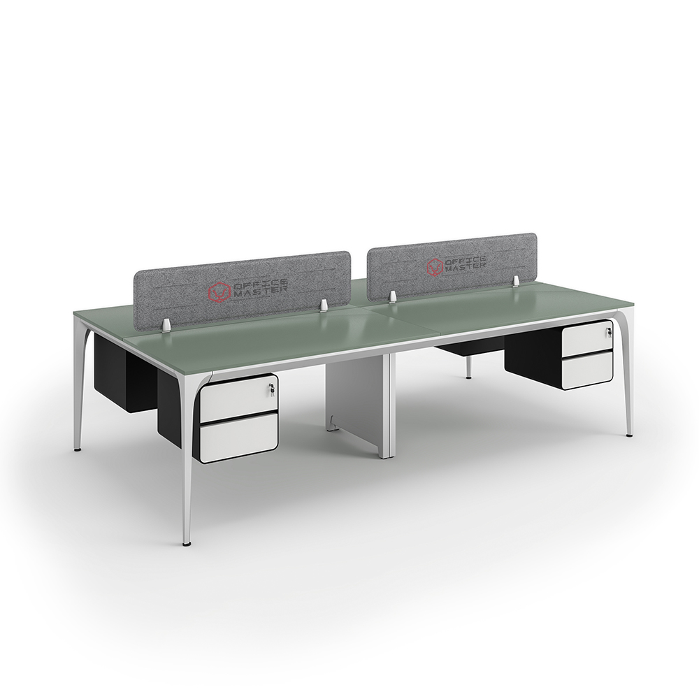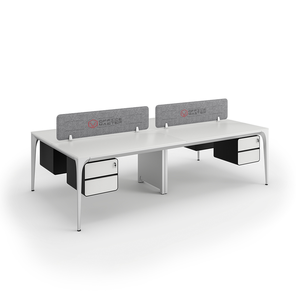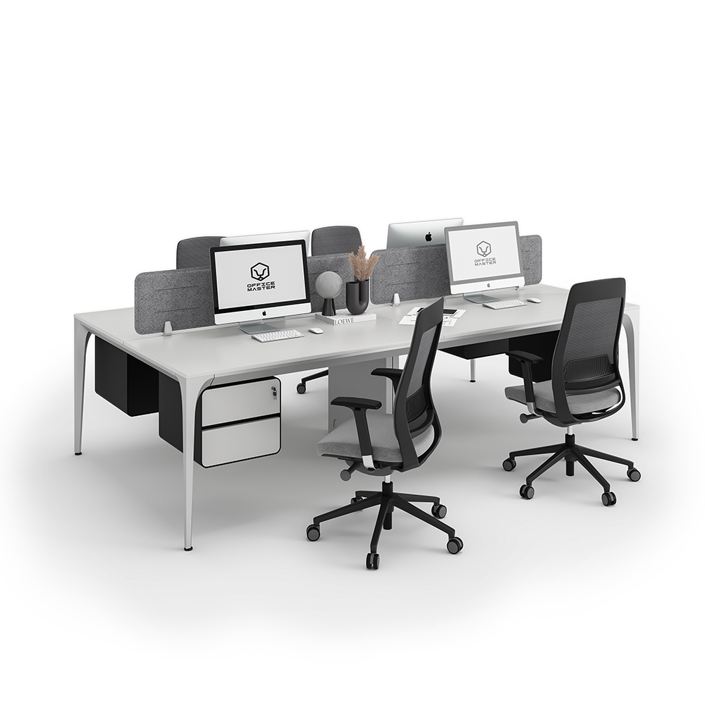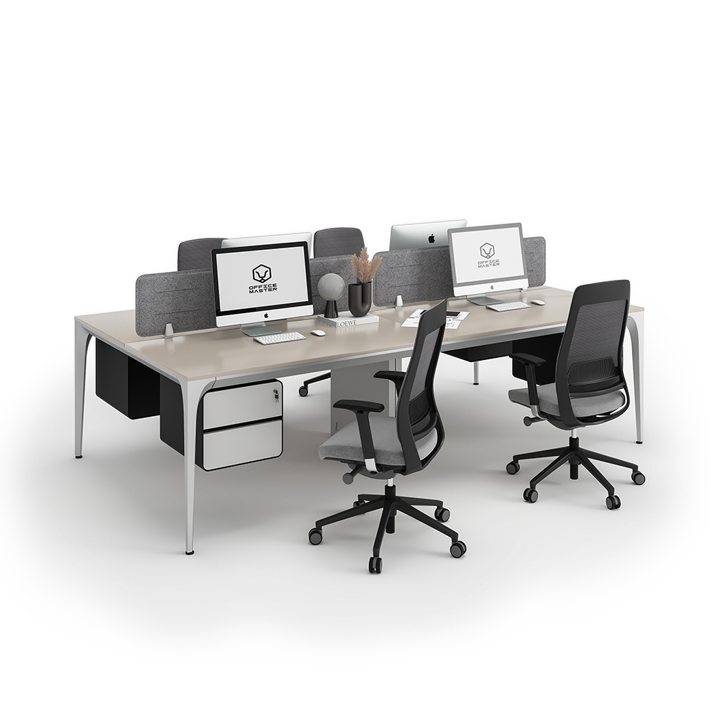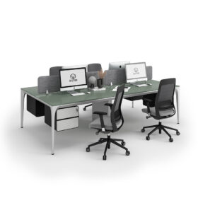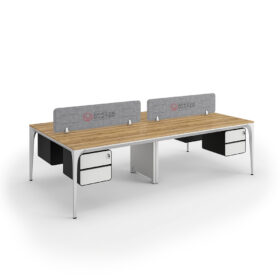 Buy Arrow series face to face workstation cluster of 4 people direct from OfficeMaster the main manufacturer in Dubai. This custom-made modern workstation cluster of 4 facing workspaces come at an affordable price with a lot of modular functional features maximizing productivity. At OfficeMaster, we craft it in a minimalist furniture layout design using a sustainable steady steel frame and legs. The top desk surface of this Arrow workstation cluster comes fully customized with high quality antibacterial boards made in Germany. In between the facing workstation clusters, there attachable customizable gray PET divider panels with the best of OfficeMaster colors and materials.