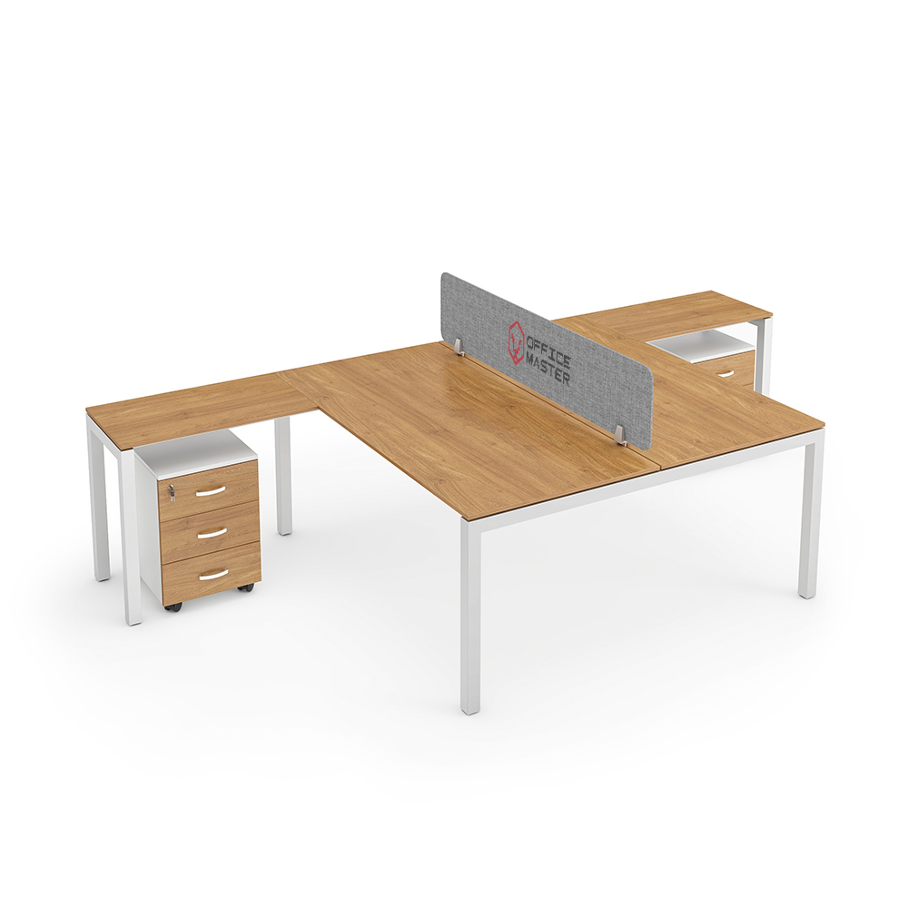 The best custom-made Bella face to face workstation cluster of 2 in a T-Shape variation is now on sale. This minimalistic office furniture layout is currently trending in Dubai because of its T-shape clustering of 2 desks. It features durable steel frame base and anti bacterial board made in Germany. Among the Bella Series face to face workstation clusters, this one integrates both the left handed and right handed office desks. Since one desk faces the other, a customizable PET screen panel separated. T-shape workstation cluster of 2 has dimensions of 140*70 (front) / 140*45 (side) cm and 160*80 (front) / 160*45 (side) cm per person. You can even contact our sales team for a bespoke branding with a selection of OfficeMaster material and colors.
